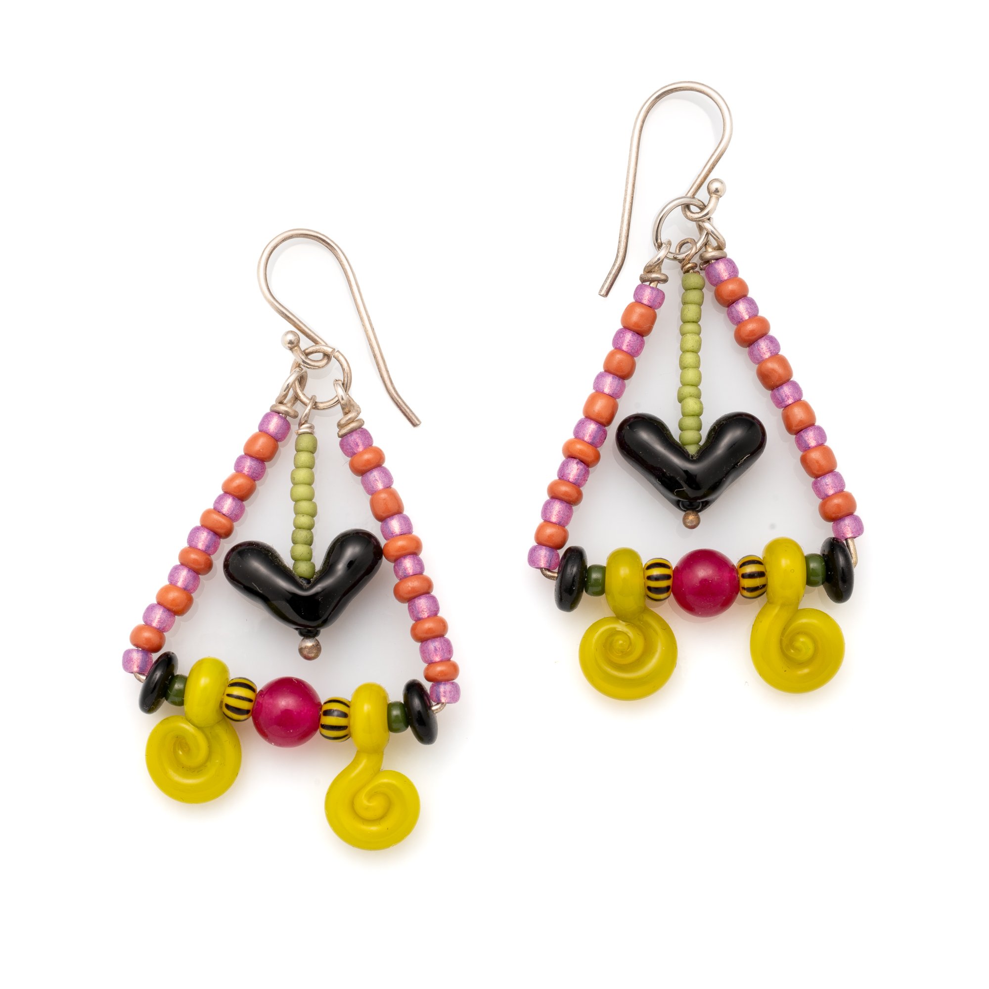 A Halloweenie version of my trapeze earrings. Handmade glass beads and seed beads on sterling wire and findings. They measure 2-3/8" long from the top of the earwire. The triangles are 1-1/8" across, at the bottom.