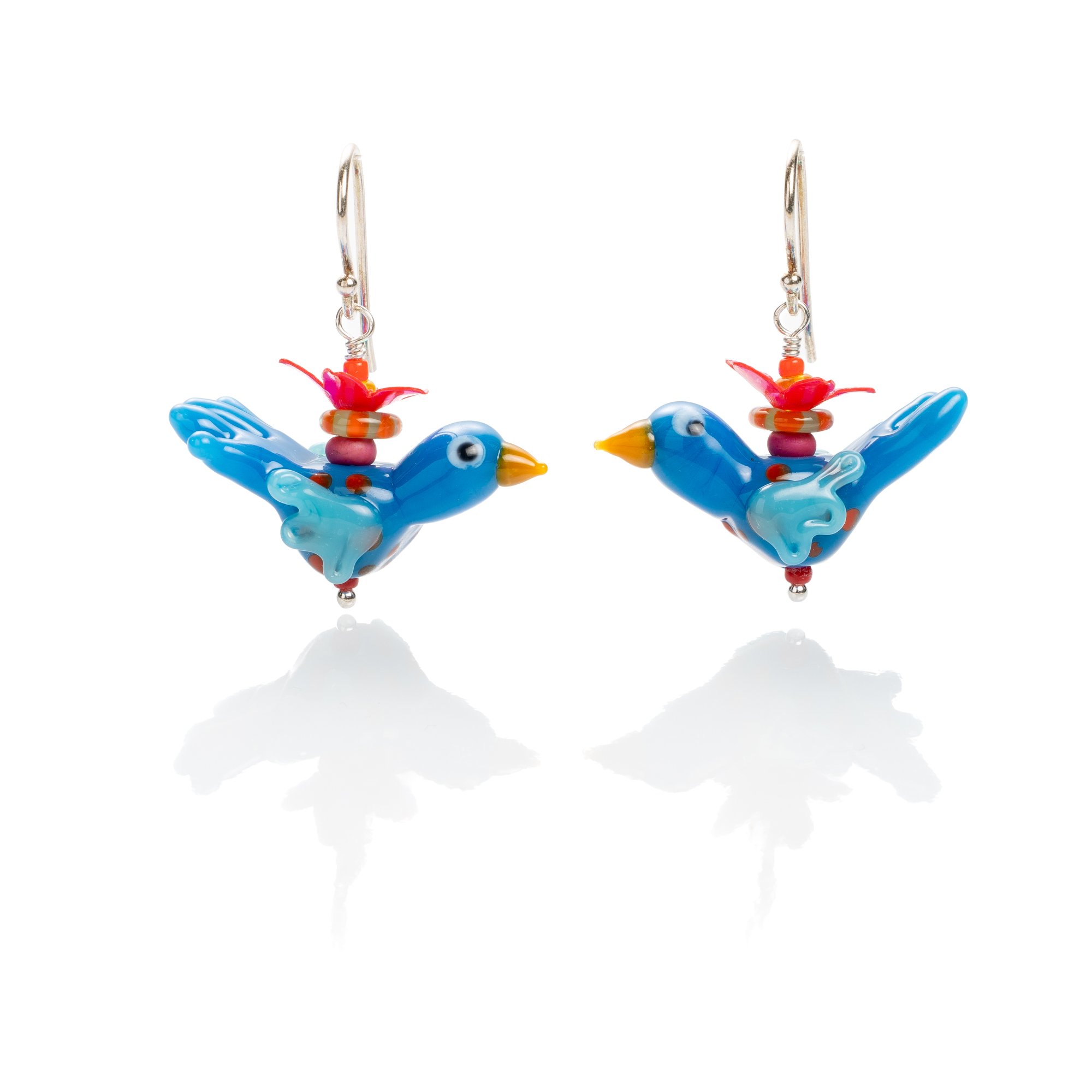 Mexico-inspired bird earrings in joyful colors. Made from handmade glass beads, seed beads, flower sequins and sterling silver findings. They hang 1-1/2" from the top of the loop. The bird is 1-1/4" long, from beak to tail.