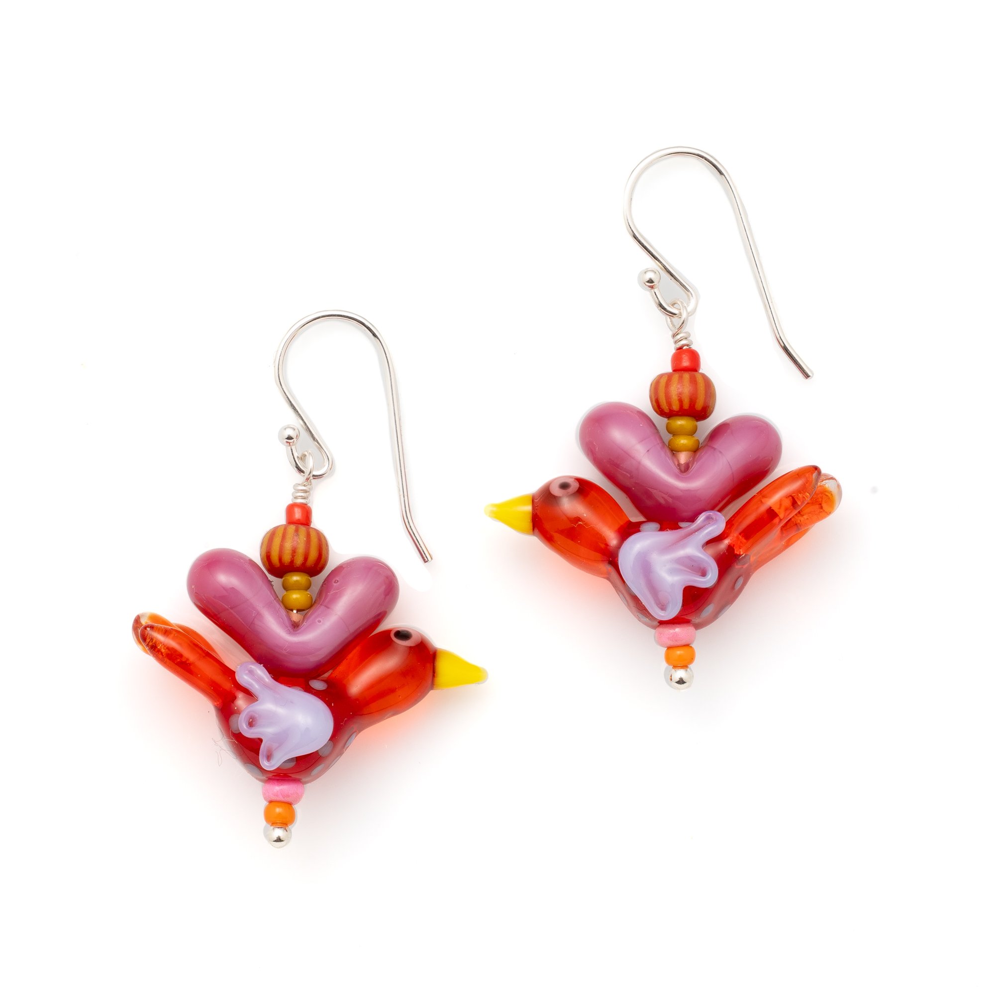 A joyful combination of hearts (for love) and birds (for freedom). Handmade glass beads, glass accent beads and sterling silver findings. They hang 1-3/4" from the top of the earwire. The bird beads are 1-1//8" long from beak to tail.