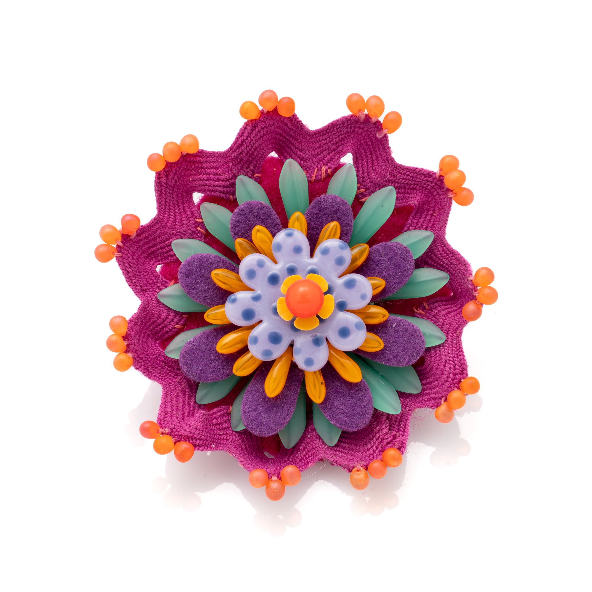 Made from my glass flower bead, Czech glass drops and teeth, ric-rac, felt, thread, brass wire and plated findings.