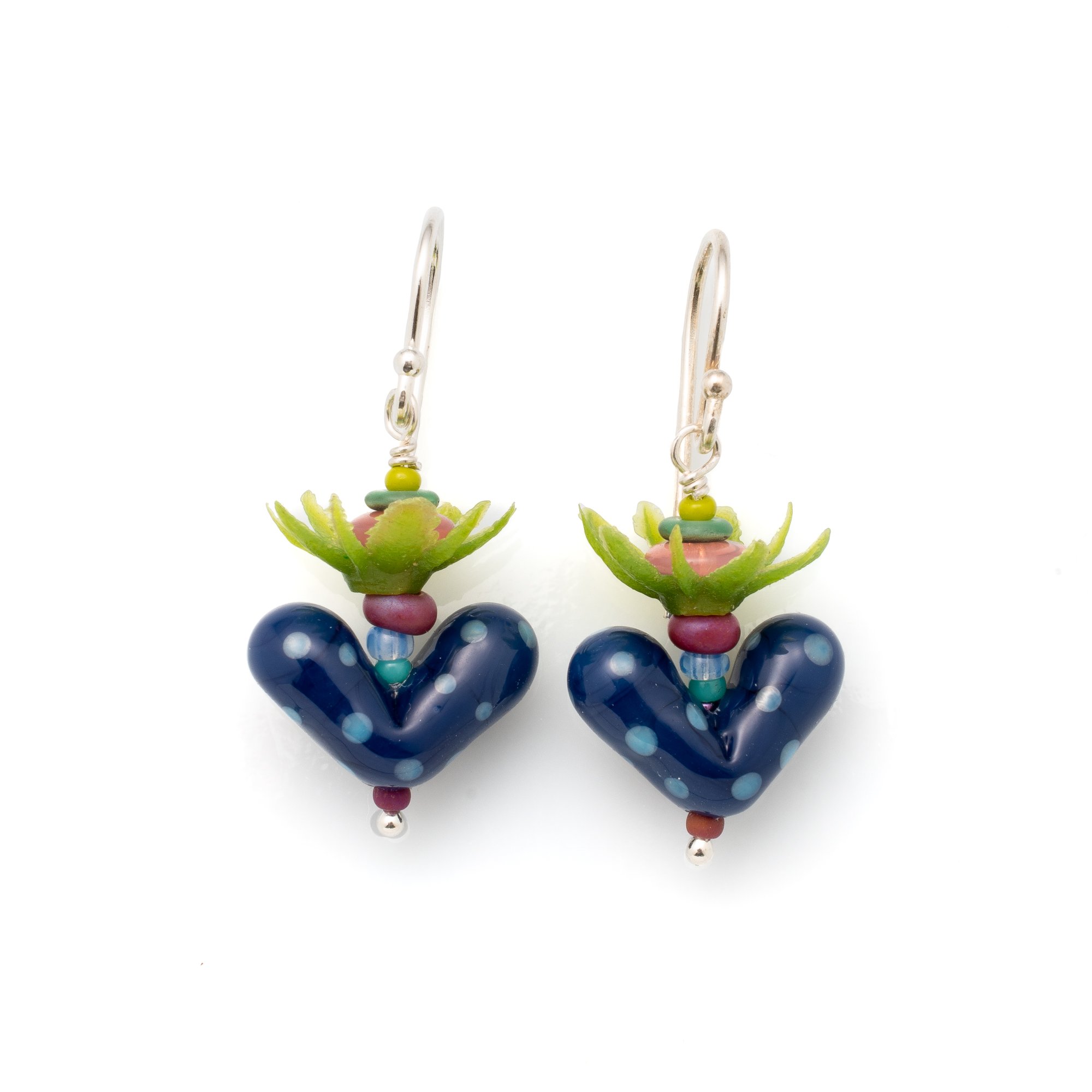 Simple little heart drops with a tiny tropical sprout. The earrings are made from my handmade glass beads, plastic bobs and seed beads. They have sterling silver findings and measure 1-1/2" long from the top of the earwire.