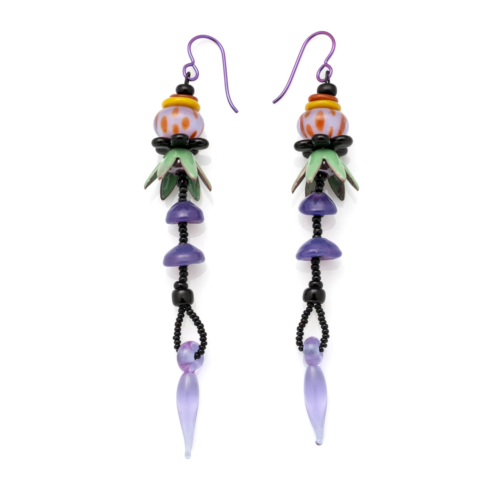 Made from my handmade glass beads, seed beads, enameled "skirts" from Gardanne Beads, Soft Flex beading wire and niobium (hypoallergenic) earwires.