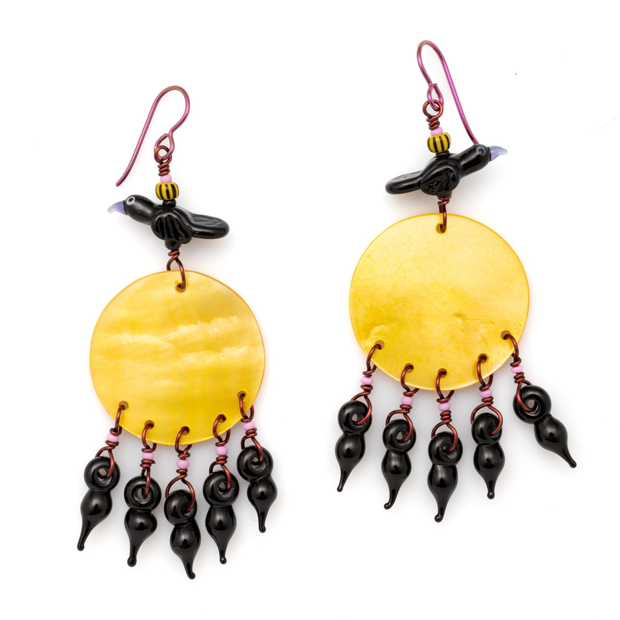 They are made from my handmade glass beads, shell components, seed beads and brass wire. The earwires are niobium.