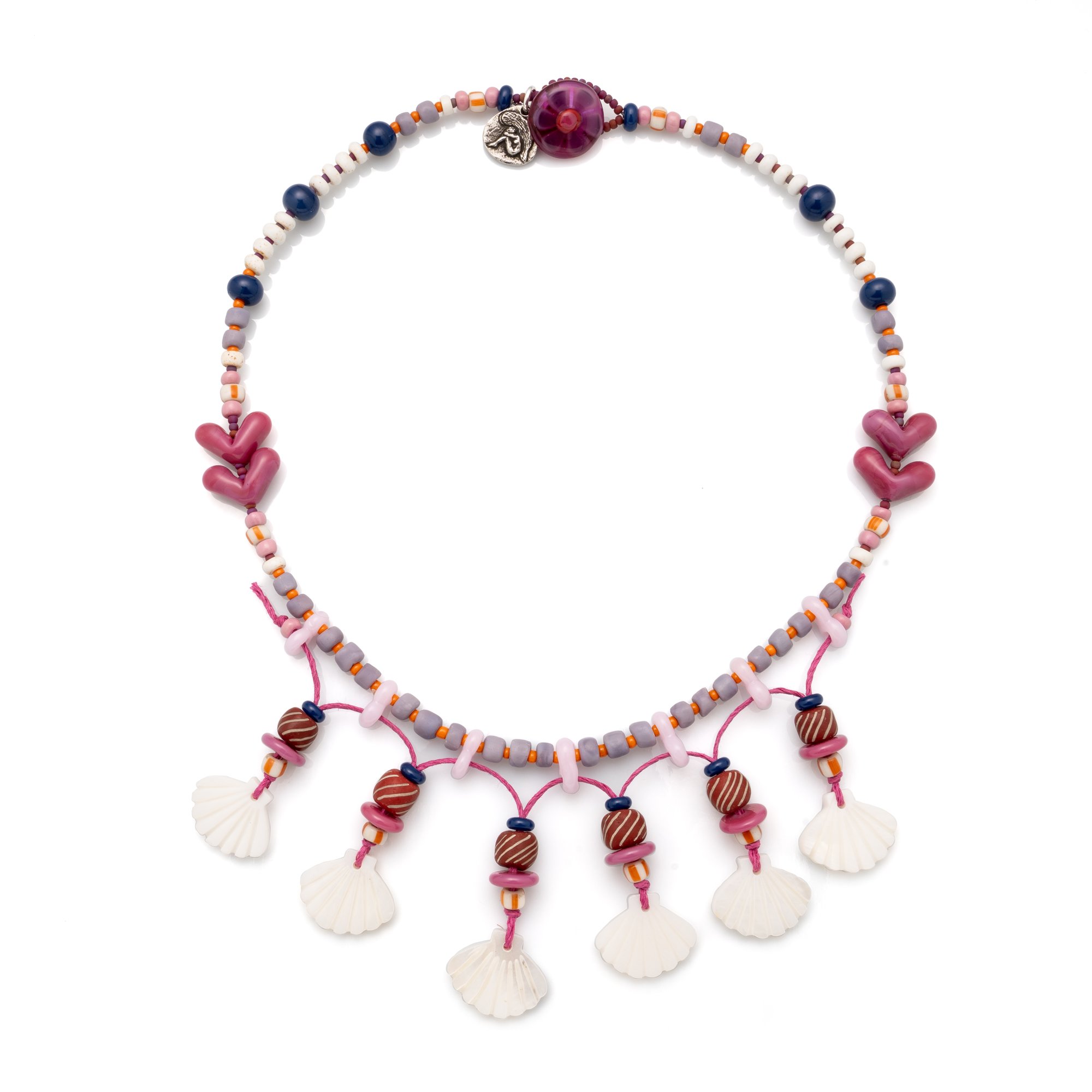 Made from my handmade glass beads, Java glass beads, carved shell pendants, and strung with seed beads on Soft Flex beading wire and cotton cord.