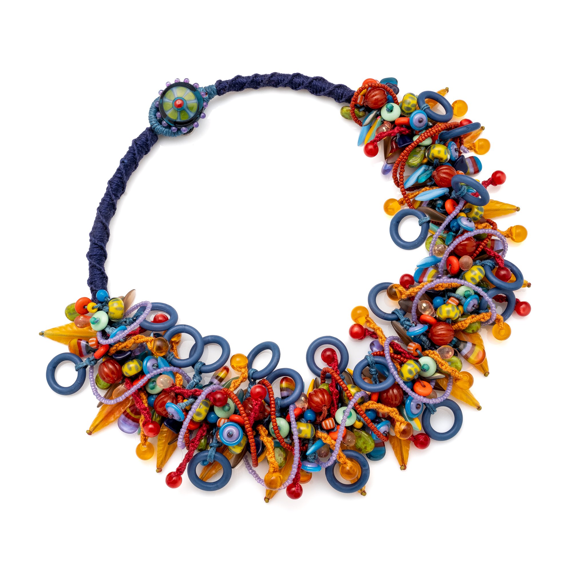 Made from my own handmade glass beads, vintage lucite and glass, lots of other beads from my collection and a stripey handmade button. Knotted together with floss and waxed linen.