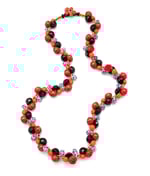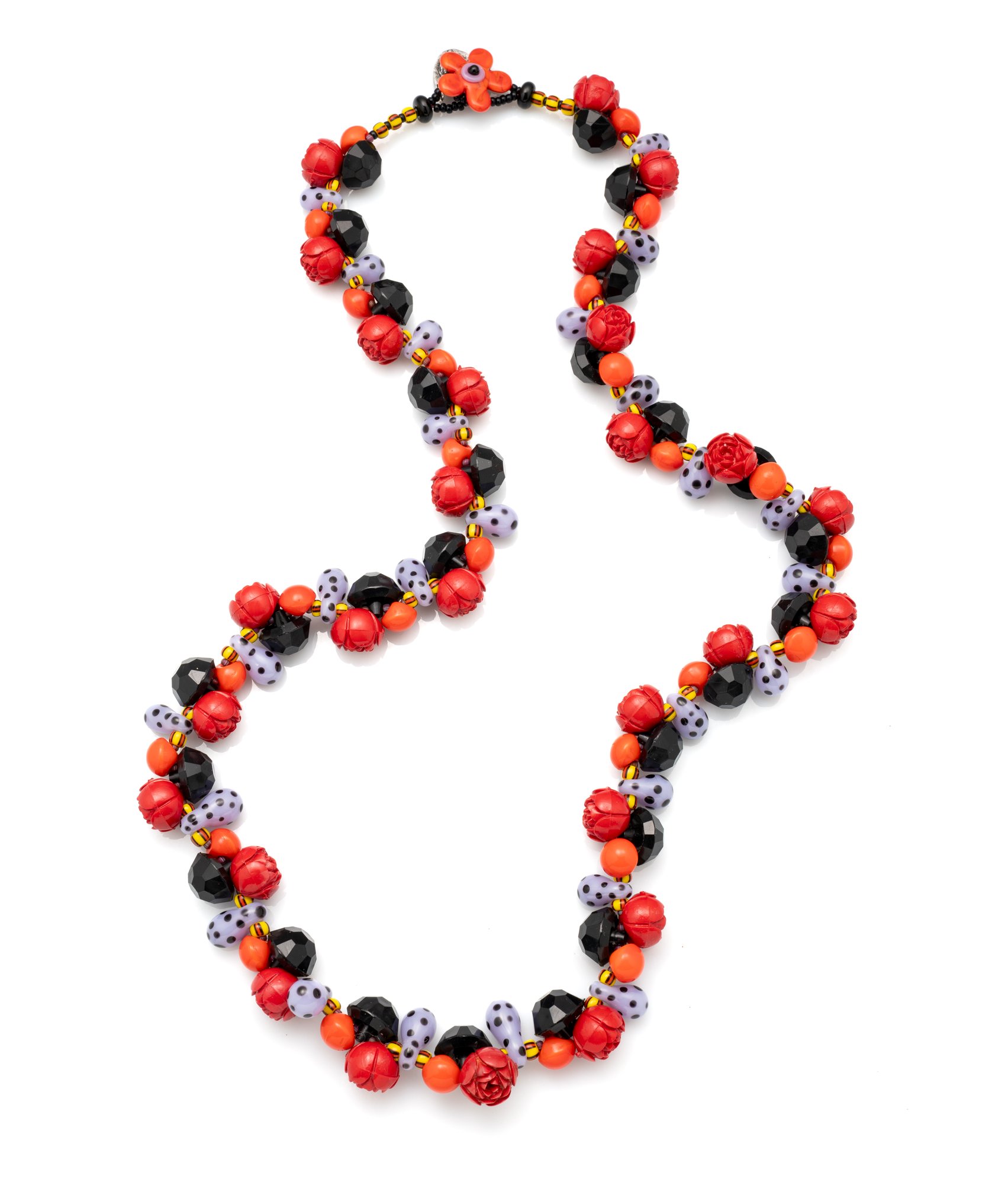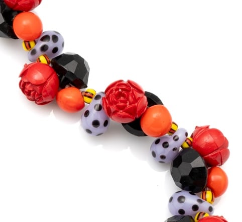 I've had a broken treasure of a necklace from the 30s on my desk for many years. It was made from these black bakelite faceted buttons and molded red flowers. I made the spotty lavender drops to spice them up and the vintage orange glass buttons made the combo just sing.